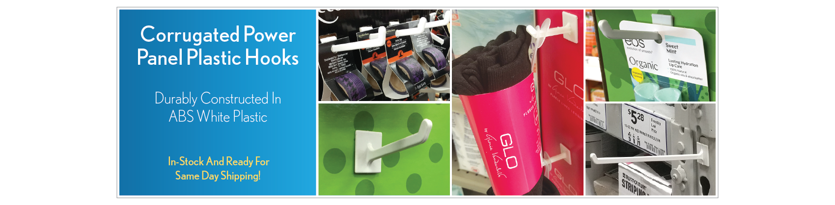 Our specially designed Plastic Corrugated Power Panel Hooks adds extra strength, thus the hooks resist sagging when loaded with product!